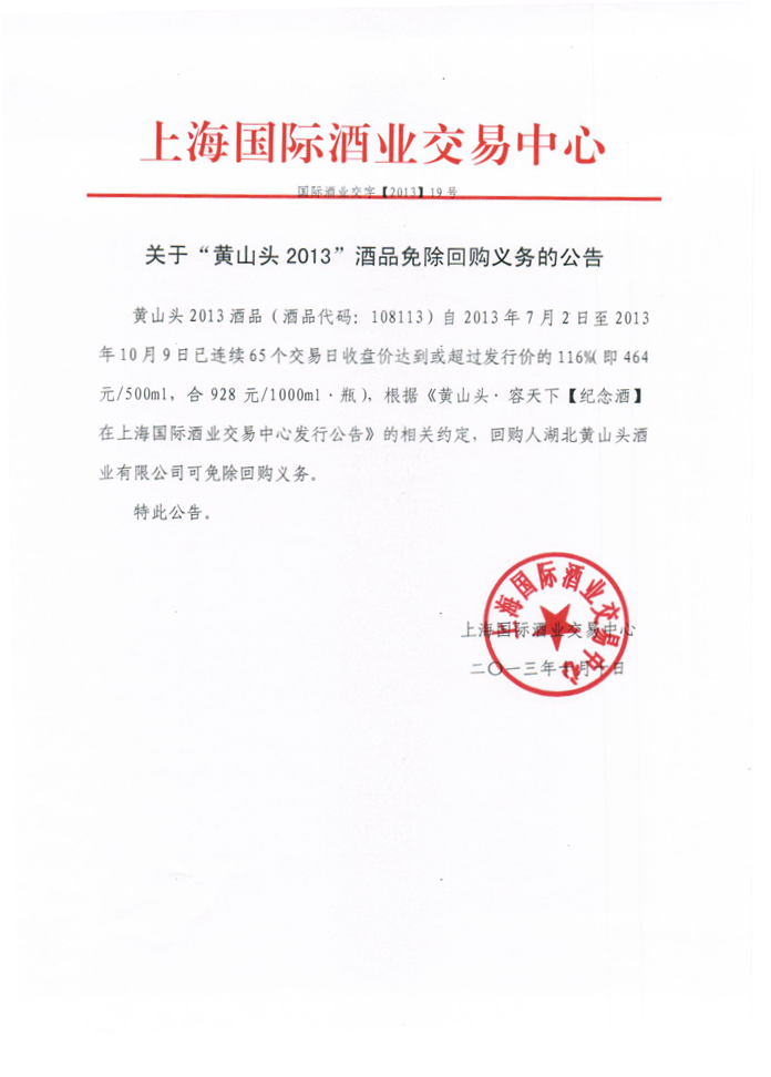关于“黄山头2013”酒品免除回购义务的公告