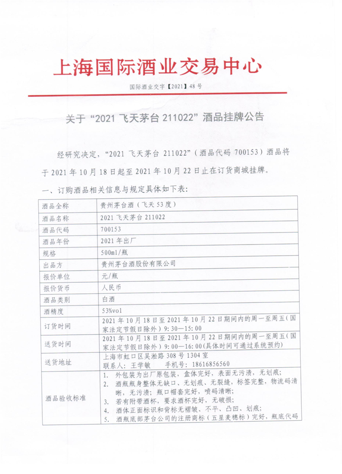 关于“2021 飞天茅台 211022”酒品挂牌公告