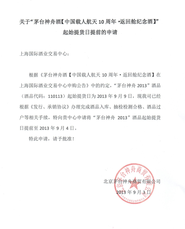 关于 “茅台神舟酒【中国载人航天10周年•返回舱纪念酒】”起始提货日提前的公告2013-09-03 08:30:00 |