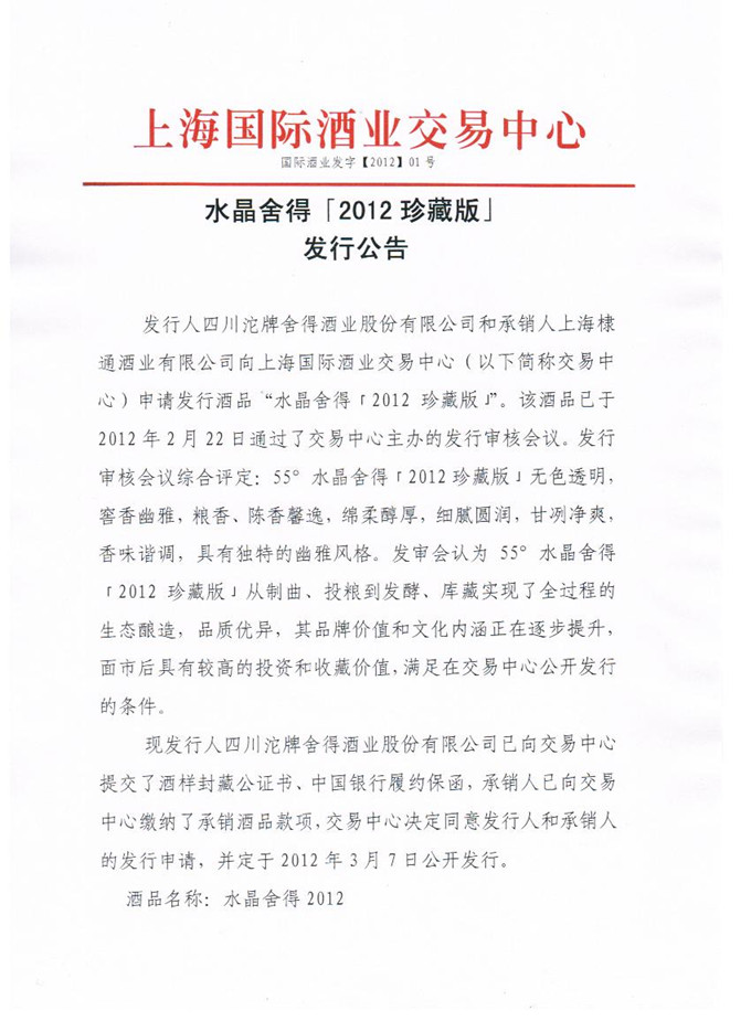 水晶舍得「2012珍藏版」在上海国际酒业交易中心发行公告.pdf